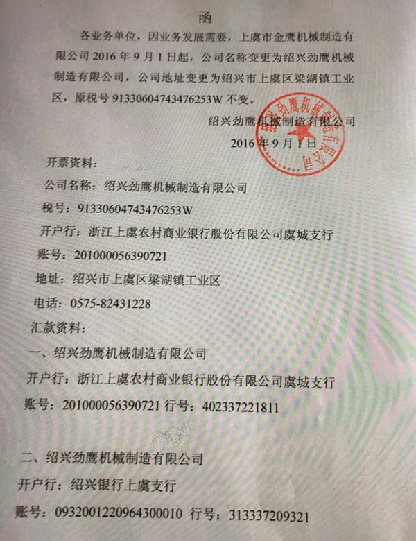 各业务单位,因业务发展需要,上虞市金鹰机械制造有限公司2016年9月1日起,公司名称变更为绍兴劲鹰机械制造有限公司,公司地址变更为绍兴市上虞区梁湖镇工业区,原税号91330604743476253W不变